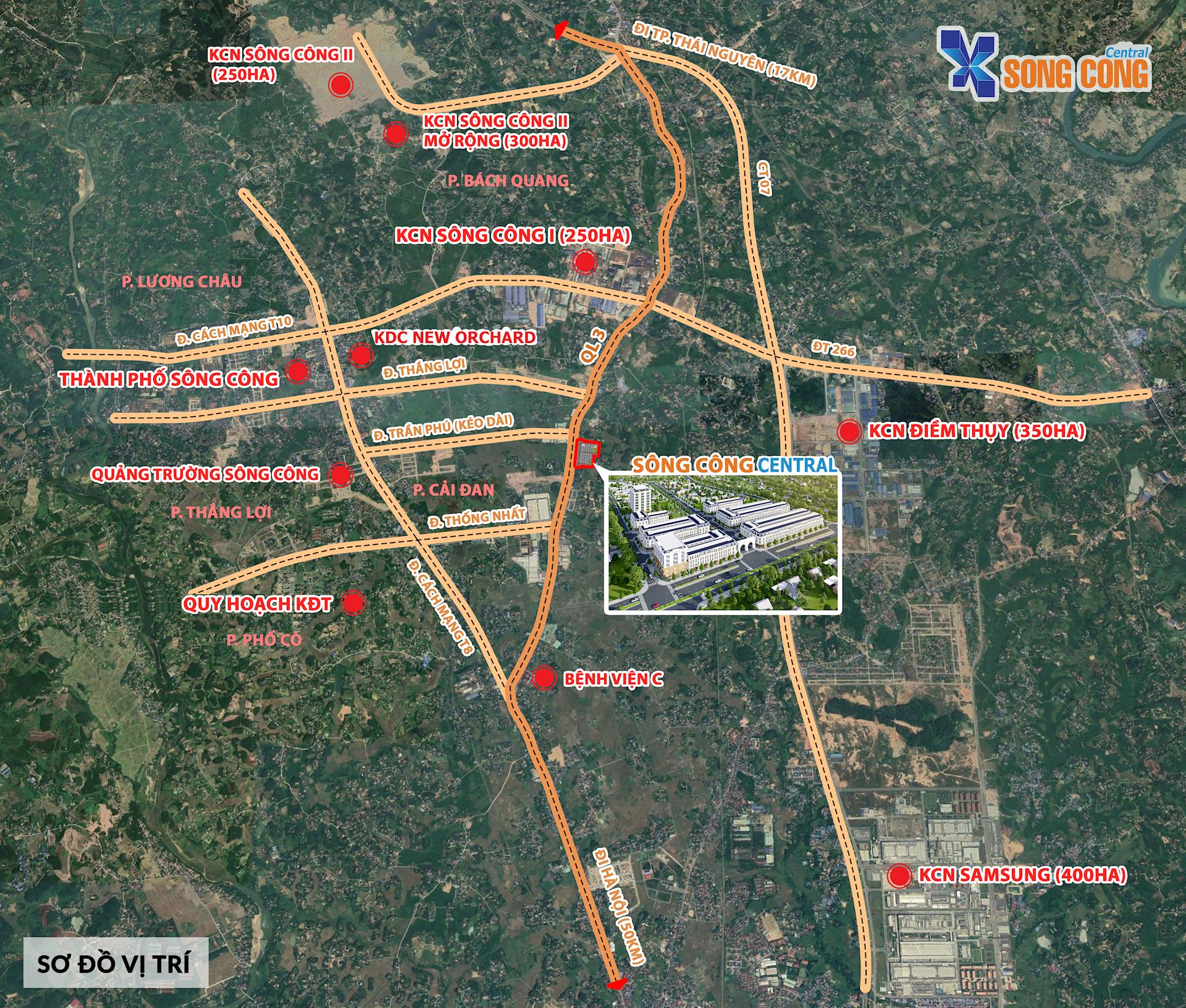 Nằm tại vị trí đắc địa nên xung quanh dự án Song Cong Central sở hữu liên kết tiện ích ngoại khu cực kỳ đẳng cấp. Khách hàng có thể di chuyển dễ dàng đến các địa địa tiện ích như: Trung tâm thành phố Thái Nguyên, Quảng trường thành phố Sông Công, Bệnh viện C, Bệnh viện đa khoa Yên Bình, Bệnh viện Quân y, Chợ trung tâm thành phố...
